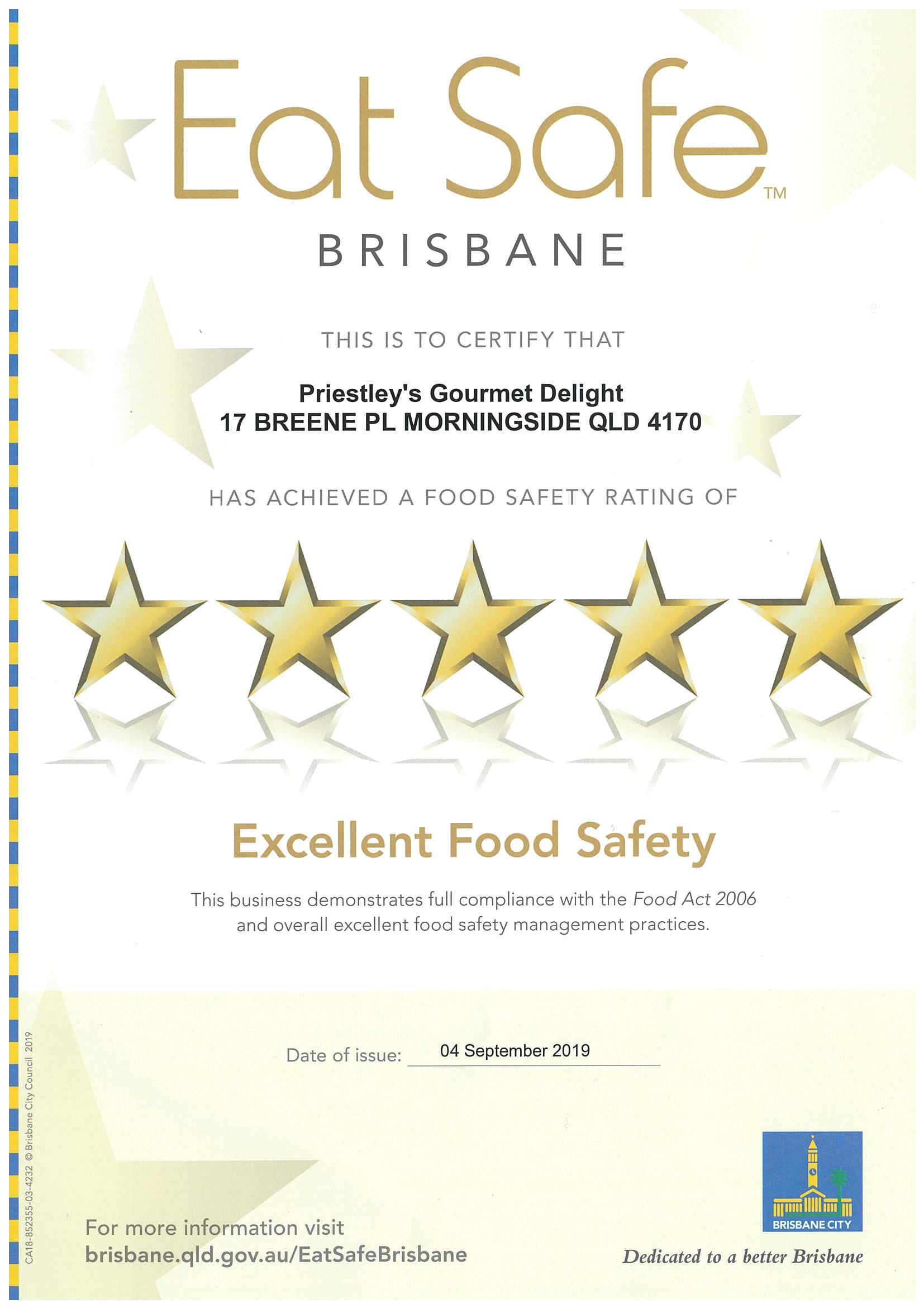 September 2019: Priestley’s Gourmet Delights has been awarded a 5 star food safety rating by Brisbane City Council.
